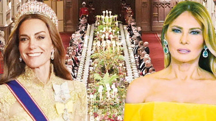 ABD Başkanı Donald Trump ve First Lady Melania Trump’ın İngiltere ziyareti kapsamında önceki gün Windsor Kalesi’nde devlet ziyafeti düzenlendi. Ev sahibi İngiliz Kraliyet Ailesi’nden Kral 3. Charles ile Kraliçe Camilla’nın yanı sıra Galler Prensi William ve Prenses Kate de katıldı. Tören, geleneksel tören geçidi, atlı araç alayı ve ordunun onur kıtasının saygı duruşu ile başladı. Güvenlik önlemleri yoğundu. Windsor bölgesinde polis, atlı birlikler, hava devriyeleri ve diğer koruma birimleri görev yaptı. Protokol gereği kale etrafındaki alanlar sınırlandırıldı. Ziyaretçilerden ve yemek sırasında yapılan konuşmalar kadar öne çıkan bir diğer detay ise davetlilere sunulan yemekler oldu.