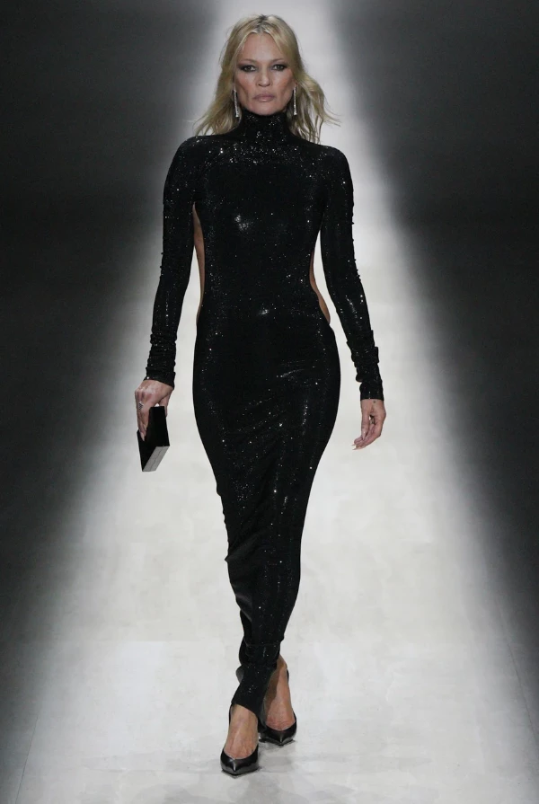 52 yaşındaki süper model Kate Moss, Milano Moda Haftası kapsamında düzenlenen Gucci 2026-2027 sonbahar-kış koleksiyonunun tanıtıldığı defilede podyuma çıktı. Geçen yıl markanın kreatif direktörlüğüne getirilen Demna Gvasalia’nın ilk defilesinde yer alan Moss, derin sırt dekolteli ve arkası kalça detaylı elbisesiyle dikkat çekti. Önden bakıldığında klasik ve ışıltılı bir tasarım izlenimi veren kıyafet, arkadan tamamen açık sırt detayıyla öne çıktı. Mücevherli Gucci logolu iç çamaşırının göründüğü tasarım, moda çevrelerinde cesur bir tercih olarak yorumlandı. Defileyi ön sırada izleyenler arasında eski kreatif direktör Alessandro Michele, Donatella Versace ve Hollywood yıldızı Demi Moore da yer aldı. Moss’un podyumdaki görünümü, daha önce Gucci ve Yves Saint Laurent’te kreatif direktörlük yapan Tom Ford’a bir saygı duruşu olarak değerlendirildi.